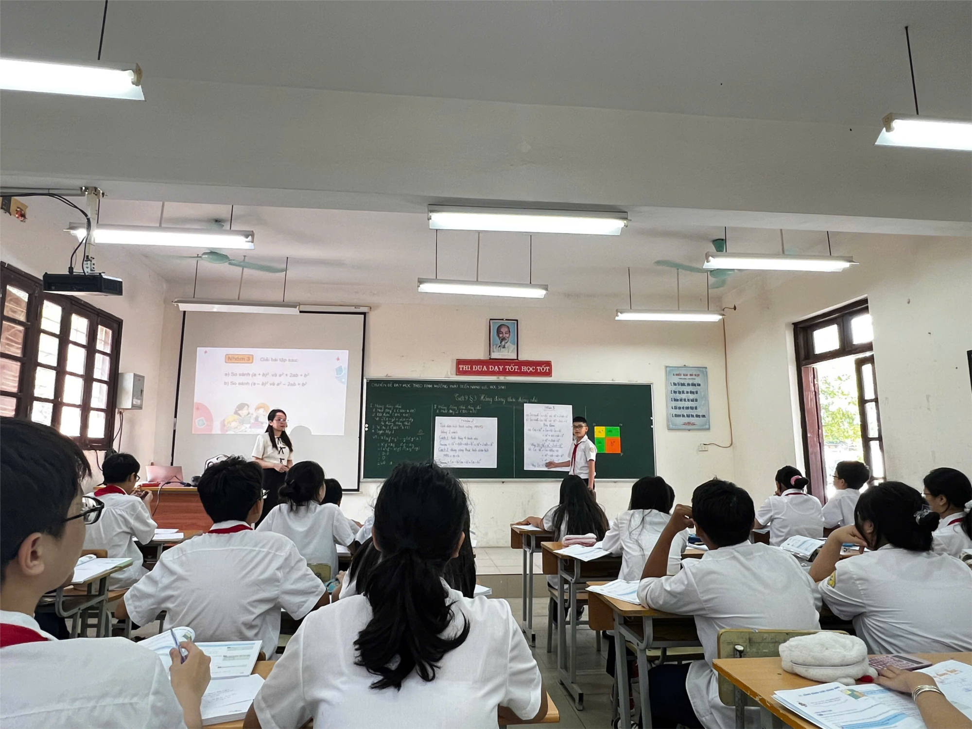 Với mục tiêu giảng dạy theo định hướng phát triển năng lực, cô Nguyễn Hoàng Anh đã lồng ghép nhiều phương pháp dạy học hiện đại, khuyến khích học sinh tự chủ trong học tập. Tiết học không còn là sự truyền đạt một chiều, mà học sinh được tham gia tích cực vào quá trình học tập thông qua các hoạt động nhóm, thảo luận, và tự giải quyết các bài toán liên quan đến hằng đẳng thức.